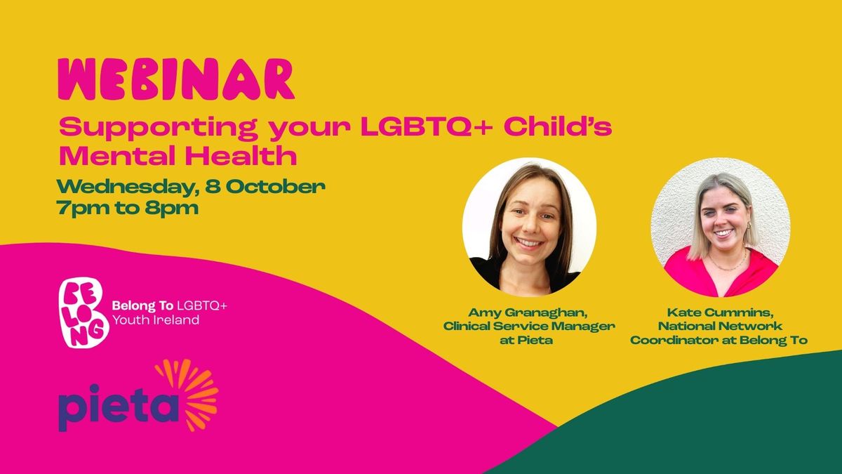Belong To and Pieta will host a free online webinar for parents and carers of LGBTQ+ young people. At this event, members of Belong To's Family Support Team and the clinical team from Pieta will share advice and guidance on how to support young people through challenges faced growing up LGBTQ+.